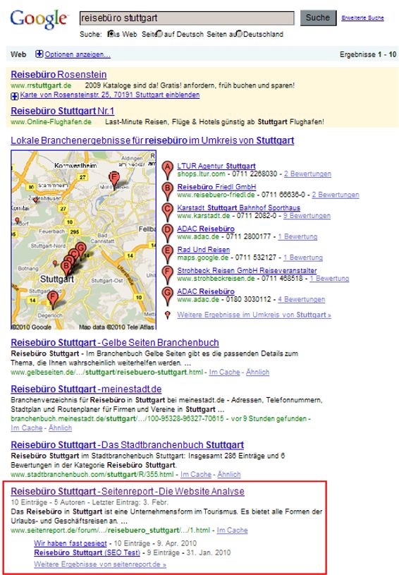 Das war natürlich für die Seitenreport-Community sofort eine Herausforderung, eben diesen Forums-Thread unter dem Suchwort Reisebüro Stuttgart auf Platz 1 zu positionieren.