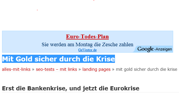 So fand ich eine Hinweis auf die geheime Euro Verschwörung über eine AdSense Anzeige (Screenshot) bei meiner Buchempfehlung “Mit Gold sicher durch die Krise“.