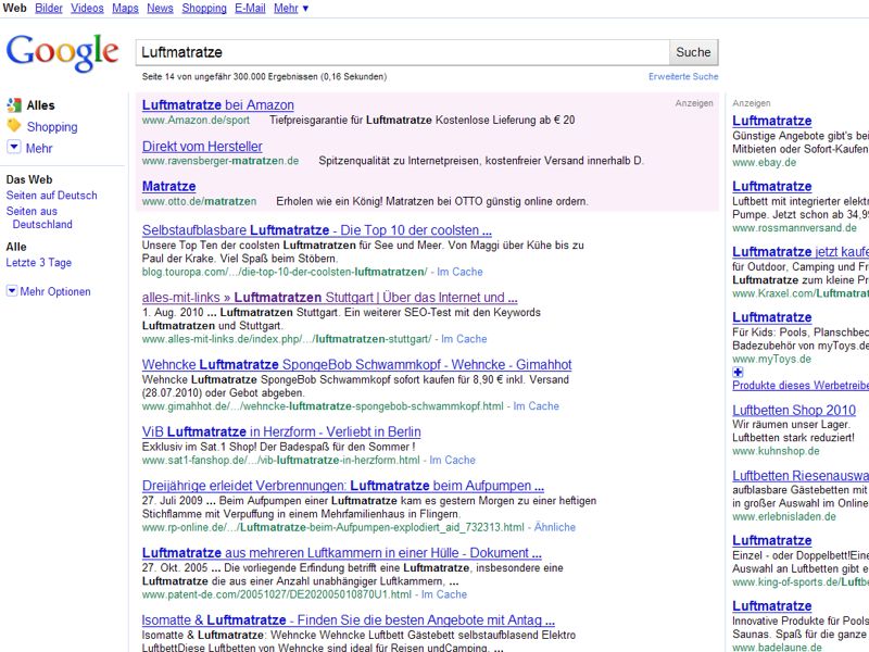 Aktuell liegt alles-mit-links bei der Suche nach Luftmatratze auf Platz 142. Ziel ist natürlich: